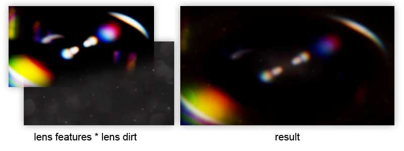 The key to this is the lens dirt texture itself. If the contrast is low, the shapes of the lens flare features tend to dominate the result. As the contrast increases, the lens flare features are subdued, giving a different aesthetic appearance, as well as hiding a few of the imperfections.