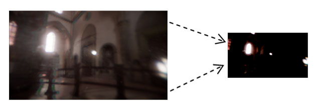 Downsampling is key to reducing the cost of subsequent stages. Additionally, we want to select a subset of the brightest pixels in the source image to participate in the lens flare. Using a scale/bias provides a flexible way to achieve this: uniform sampler2D uInputTex;